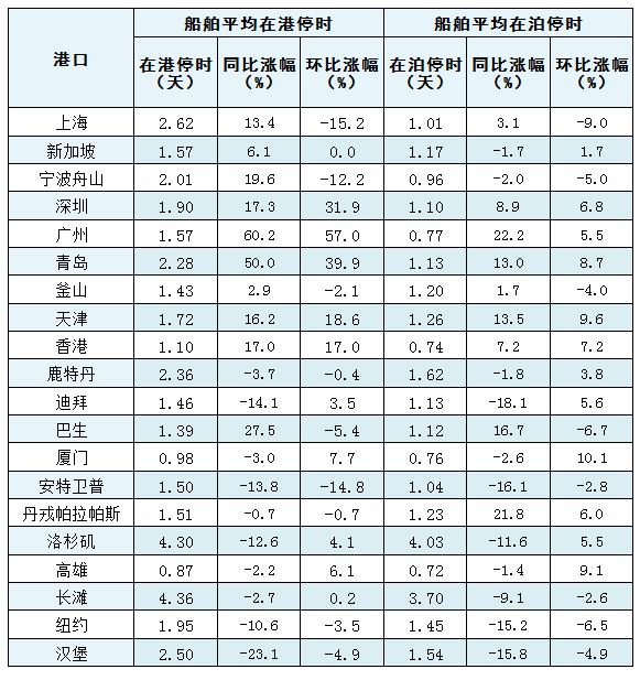 船舶在港时间是指船舶抵达港口待泊锚地到靠泊完成装卸作业离开泊位之间的总时长。该指标集中体现了港口设施设备、引航、调度、装卸、集疏运、口岸通关等综合效率。