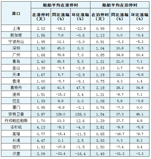 船舶在港时间是指船舶抵达港口待泊锚地到靠泊完成装卸作业离开泊位之间的总时长。该指标集中体现了港口设施设备、引航、调度、装卸、集疏运、口岸通关等综合效率。