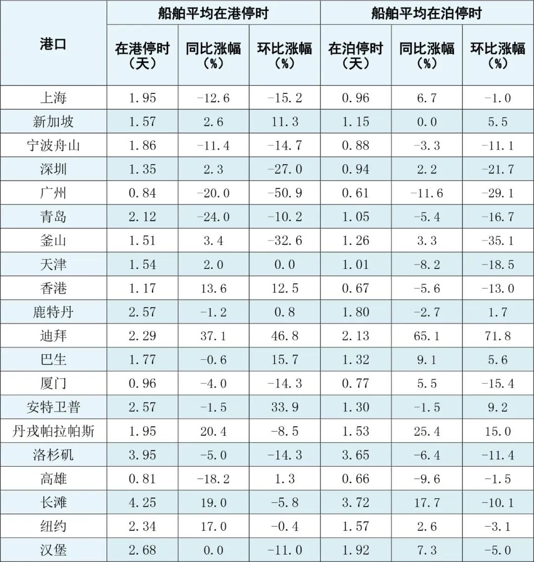 2026年3月全球主要港口远洋国际集装箱船舶平均在港在泊停时